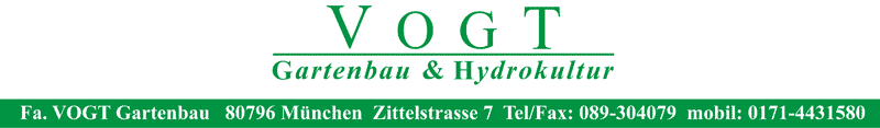 Vogt Gartenbau & Hydrokultur Zittelstrasse 7 80796 München Tel/Fax: 089-304079 Mobil: 0171-4431580 e-Mail: heidi.vogt@nexgo.de www.vogt-hydrokultur.de |